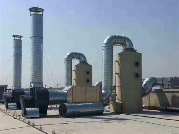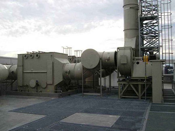 上圖中黑色的風(fēng)機(jī)為防爆型玻璃鋼離心風(fēng)機(jī),廢氣處理塔的材質(zhì)選擇的是pp材料,管道則使用的是碳鋼材料。